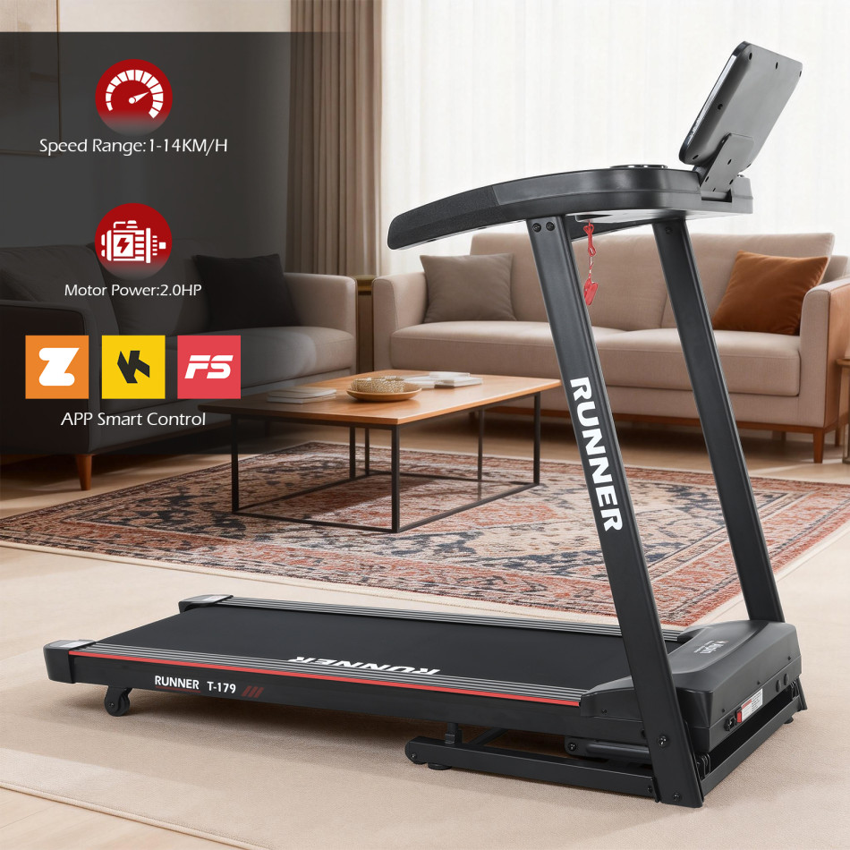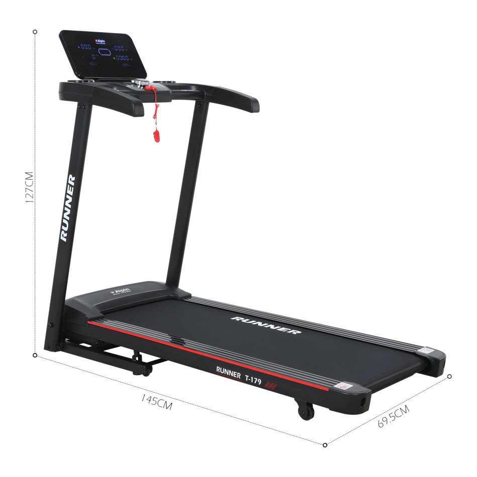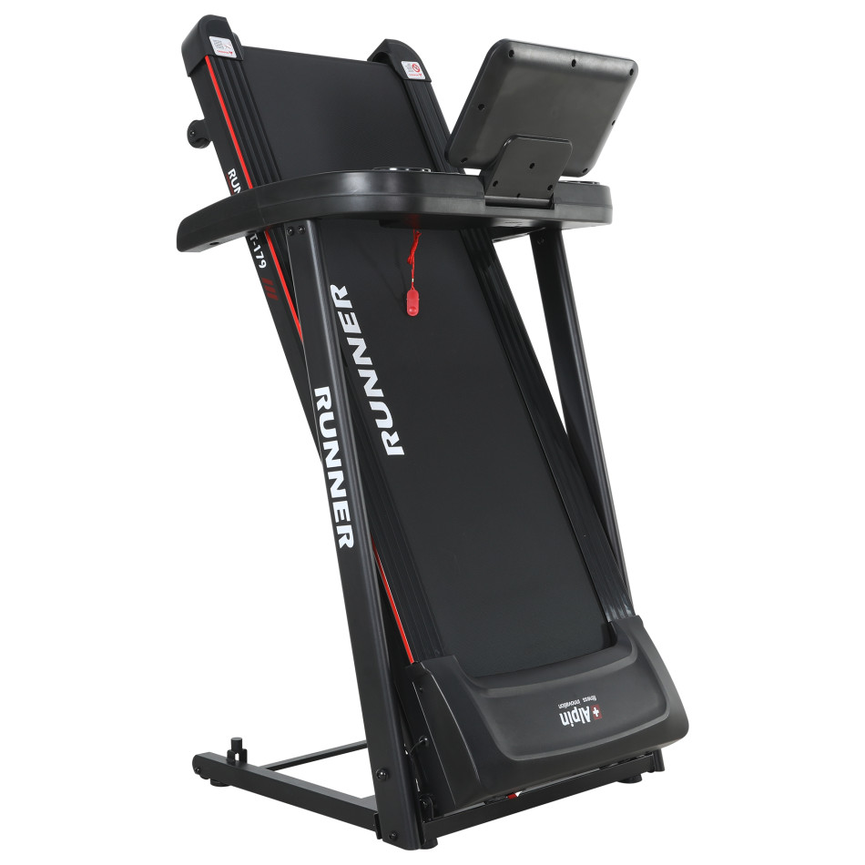 Alpin Runner T-179 – современная электрическая беговая дорожка, прекрасно сочетающая в себе просторное полотно, мощный двигатель, многофункциональный компьютер и разумную цену. Плавное и уверенное движение полотна на скорости от 1,0 до 14 км/ч обеспечивает надежный двигатель постоянного тока мощностью 2,0 л.с., при этом уровень шума не превышает 52 дБ. Мощность двигателя позволяет заниматься на тренажере пользователям весом до 120 кг. Большое беговое полотно размером 120 см в длину и 42 см в ширину – обеспечит комфортные и безопасные тренеровки. Верхний слой полотна выполнен из специального полимера, который не только гарантирует длительную эксплуатацию, но и за счет ромбовидной формы поверхности обеспечивает надежное сцепление обуви с полотном и дополнительную амортизацию. В основе конструкции одинарной деки лежит древесно-волокнистая композитная плита средней плотности. Ее толщина составляет 16 мм, она обработана парафином для мягкого и долговечного скольжения. Одной из важных особенностей данной модели является складная конструкция, которая поможет компактно хранить беговую дорожку в домашних условиях. При покупке тренажера Alpin Runner T-179 Вы получаете рекомендации по питанию и тренировкам от известного швейцарского фитнес-тренера!