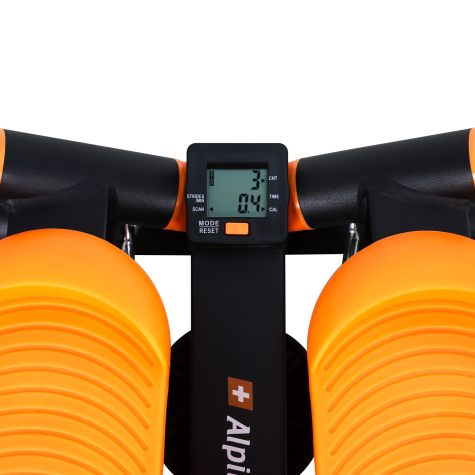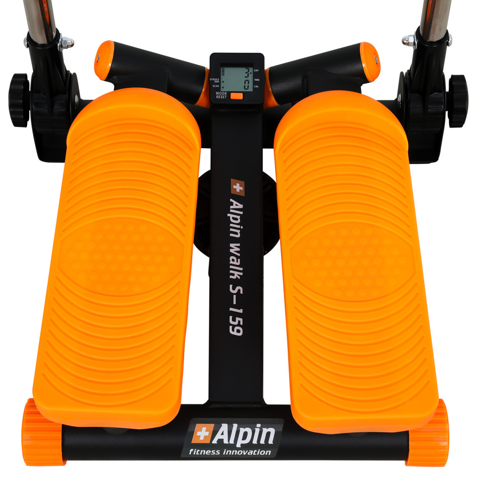 Степпер поворотный с подвижными палками Alpin Walk S-159 отличный компактный мини спортзал у вас дома. В основе степпера лежит прочная стальная рама, он оснащен широкими удобными педалями с нескользящей поверхностью, имеет телескопические палки с регулировкой высоты. Встроенный компьютер отображает все основные параметры тренировки: время, количество шагов, калории.